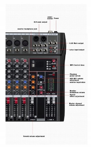 - Совместимость микшера с различными устройствами, такими как комбинация микрофона и инструментов, подходящая для семейного КТВ, выступлений групп, мероприятий в кампусе, конференций и других мероприятий. Аудио поддерживает проводное/беспроводное/конденсаторное подключение микрофона/инструмента, подходящее для домашнего КТВ, выступлений групп, мероприятий в кампусе, конференций и других мероприятий.