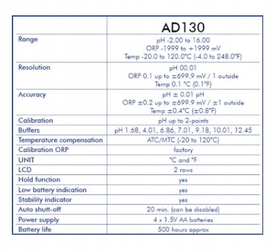 Портативный, профессиональный мультиметровый AD130 (pH/ORP/температура) предназначен для пользователей, требующих самой высокой точности. Температура) С помощью -функция удержания, которая позволяет заморозить показания на экране, чтобы легко считывать данные. AD130: