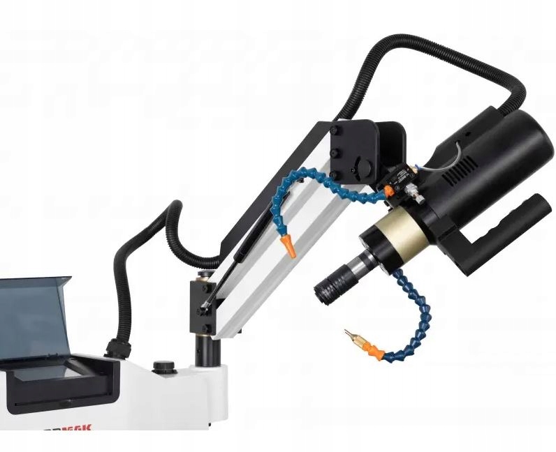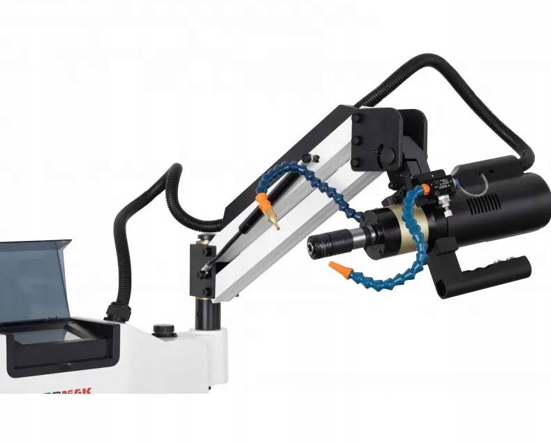 Рычаг-метчик оснащен быстрозажимным держателем, позволяющим легко и быстро прикрепить метчики к сквозные и глухие отверстия. Кроме того, устройство имеет вращающийся моторный блок, позволяющий нарезать резьбу под любым углом от 0° до 90°. По сравнению с ручной нарезкой резьбы, резьбонарезной станок обеспечивает большую точность и надежность нарезания резьбы при сохранении прямого угла (90°).