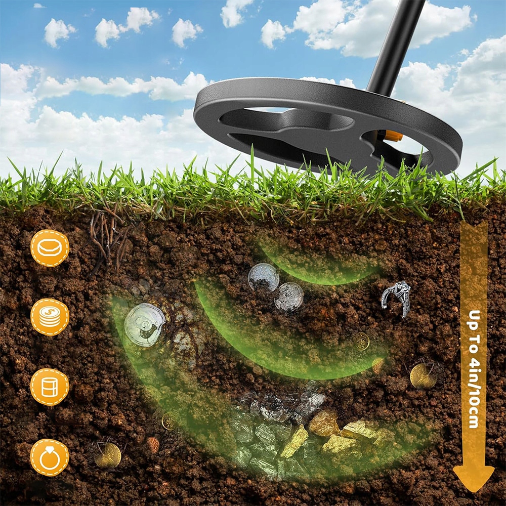 Вы можете легко контролировать уровень водонепроницаемости детектора металла, который подходит для обнаружения различных типов металлических объектов. Катушка обнаружения 6,5 -дюймового обнаружения может обнаружить объекты глубиной до 10 см, включая железо, алюминий, монеты и кольца, так что вы можете погрузиться в мир исследования.