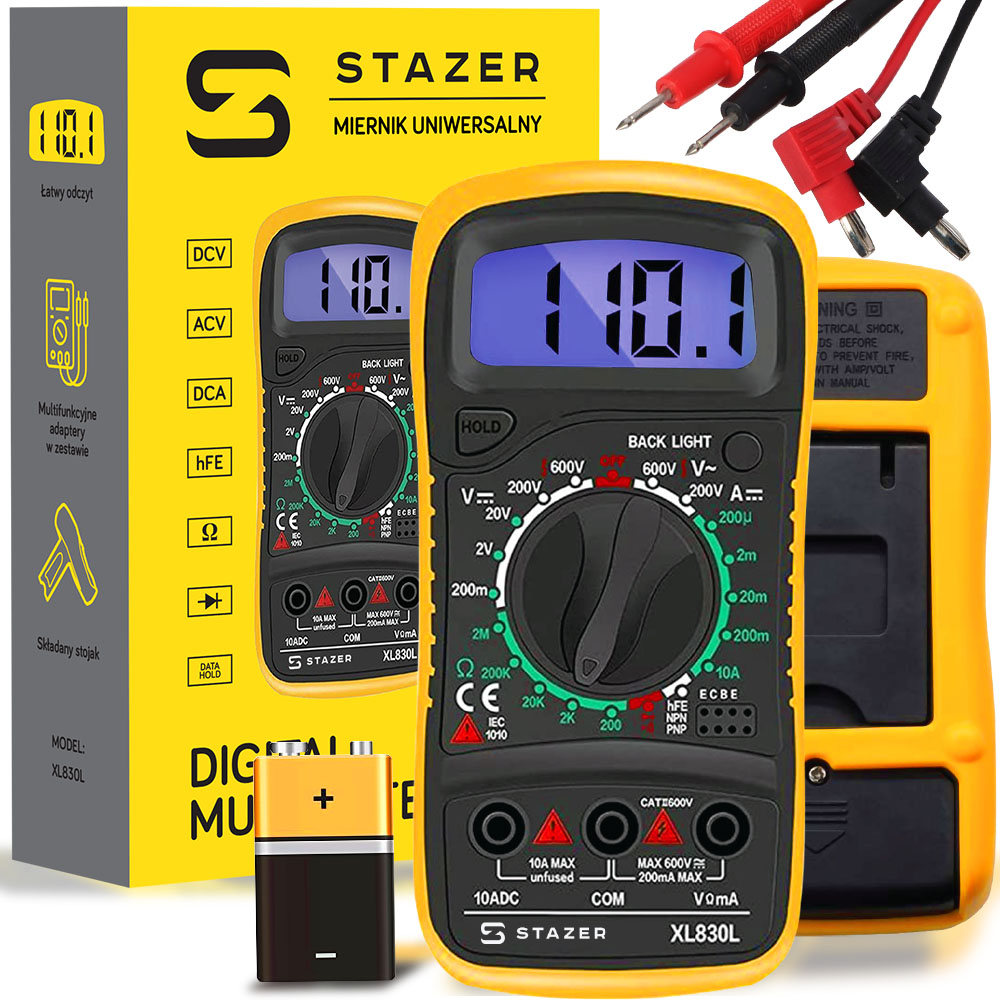 Профессиональный мультиметр — высококачественный продукт, который отлично подойдет как продвинутым пользователям электроники, так и любителям. Он имеет индикатор низкого заряда батареи и регулируемую подставку, которая значительно упрощает считывание результатов. Измеритель оснащен прочной резиновой крышкой, автоматическим выключателем подсветки, эффективно предотвращающим разряд батареи, и функцией запоминания последнего измерения – кнопкой HOLD. В комплект входят тестовые провода и аккумулятор, благодаря чему счетчик готов к работе после покупки.