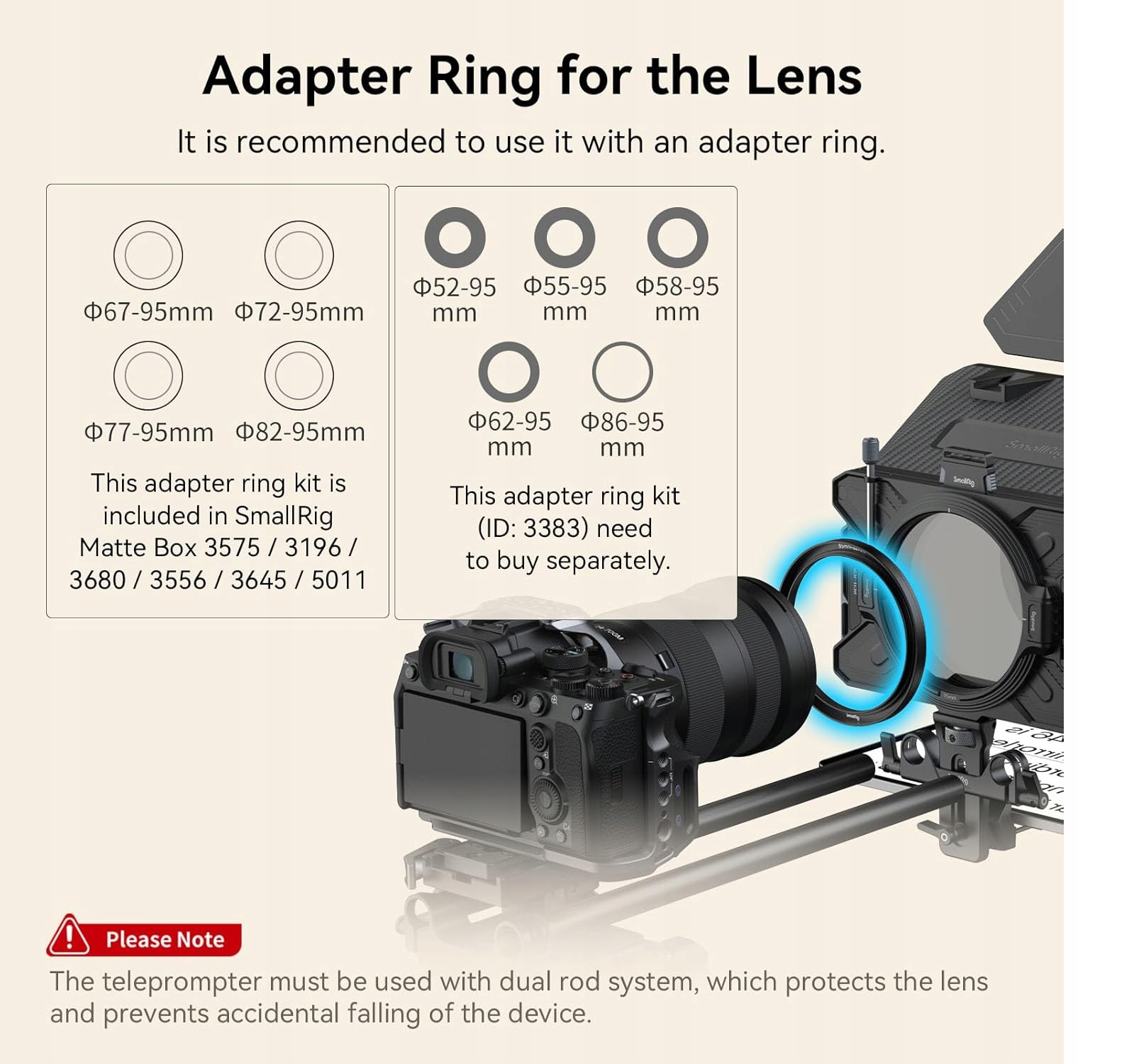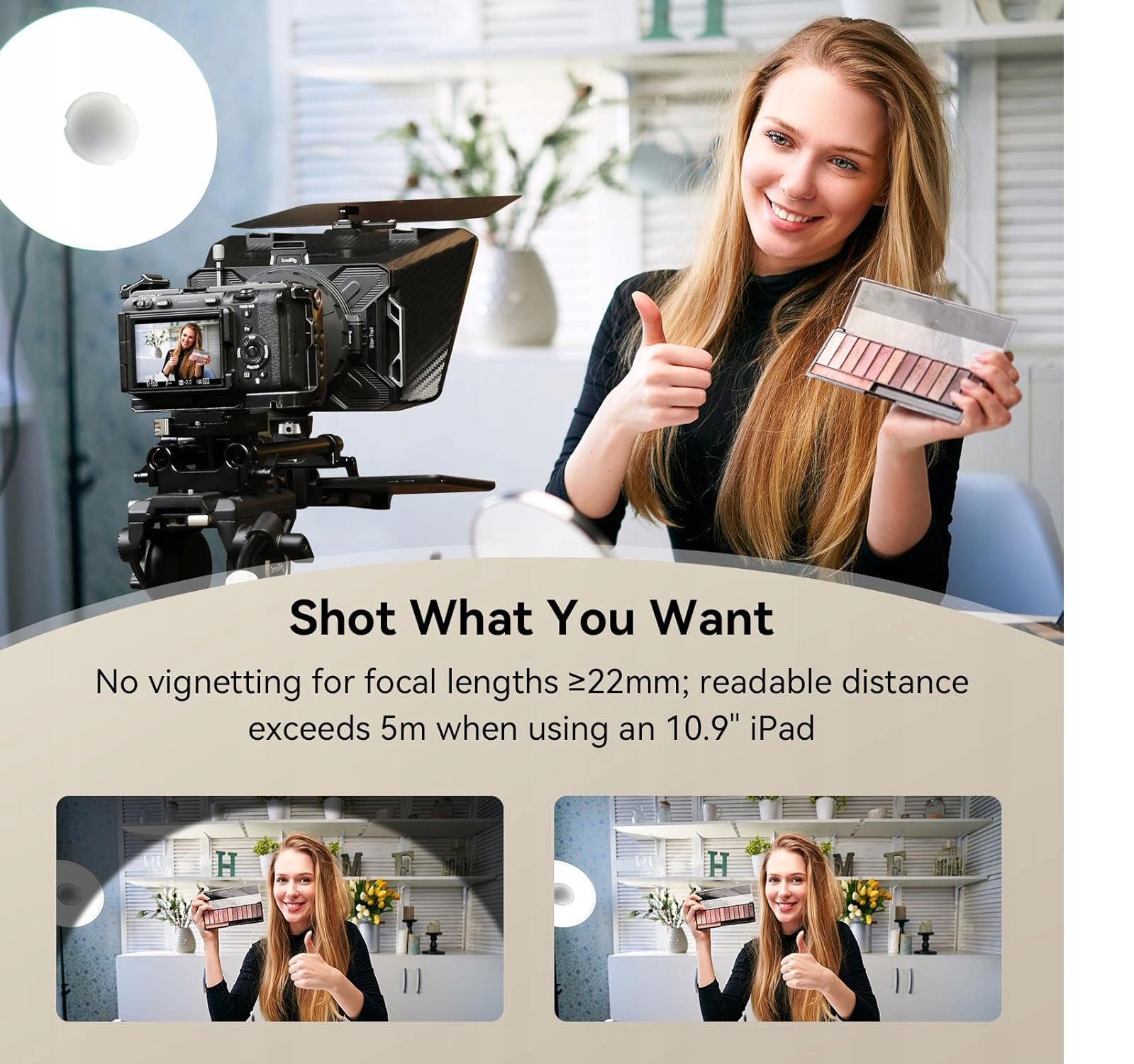 - Для зеркальных/беззеркальных камер/видеокамер: многофункциональные SmallRig's Телесуфлер 3646 предназначен для любого iPad или планшета с экраном до 11 дюймов. Обратите внимание, что этот телесуфлер с камерой обеспечивает практическое решение, позволяющее оставаться активным во время видеоконференции или прямой трансляции без необходимости просматривать заметки с камеры на отдельном экране. Рекомендуемое расстояние для чтения — должно работать с опорной пластиной LWS 15 мм: для обеспечения правильной работы на расстоянии просмотра этот телесуфлер необходимо использовать с 15-миллиметровой направляющей системой поддержки (продается отдельно, идентификатор: 2092B / 3067). Такая конструкция помогает снизить давление на объектив и защитить держатель объектива камеры.