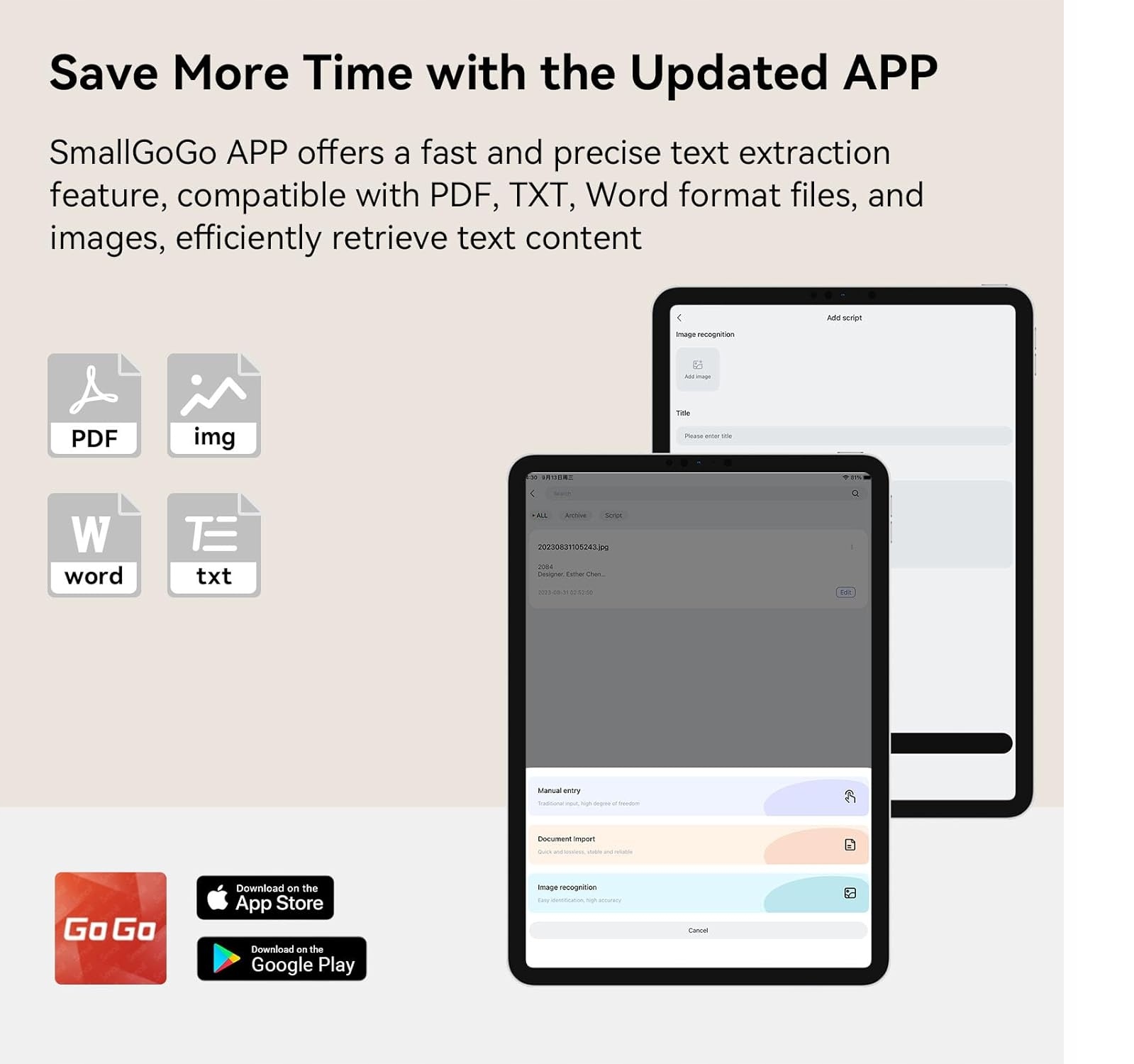 - Управление приложением: с помощью приложения SmallGoGo, доступного в Apple Store и Android Market, вы можете извлекать текст. из PDF-файлов, изображений, документов Word и файлов TXT и редактируйте их для использования с телесуфлером.