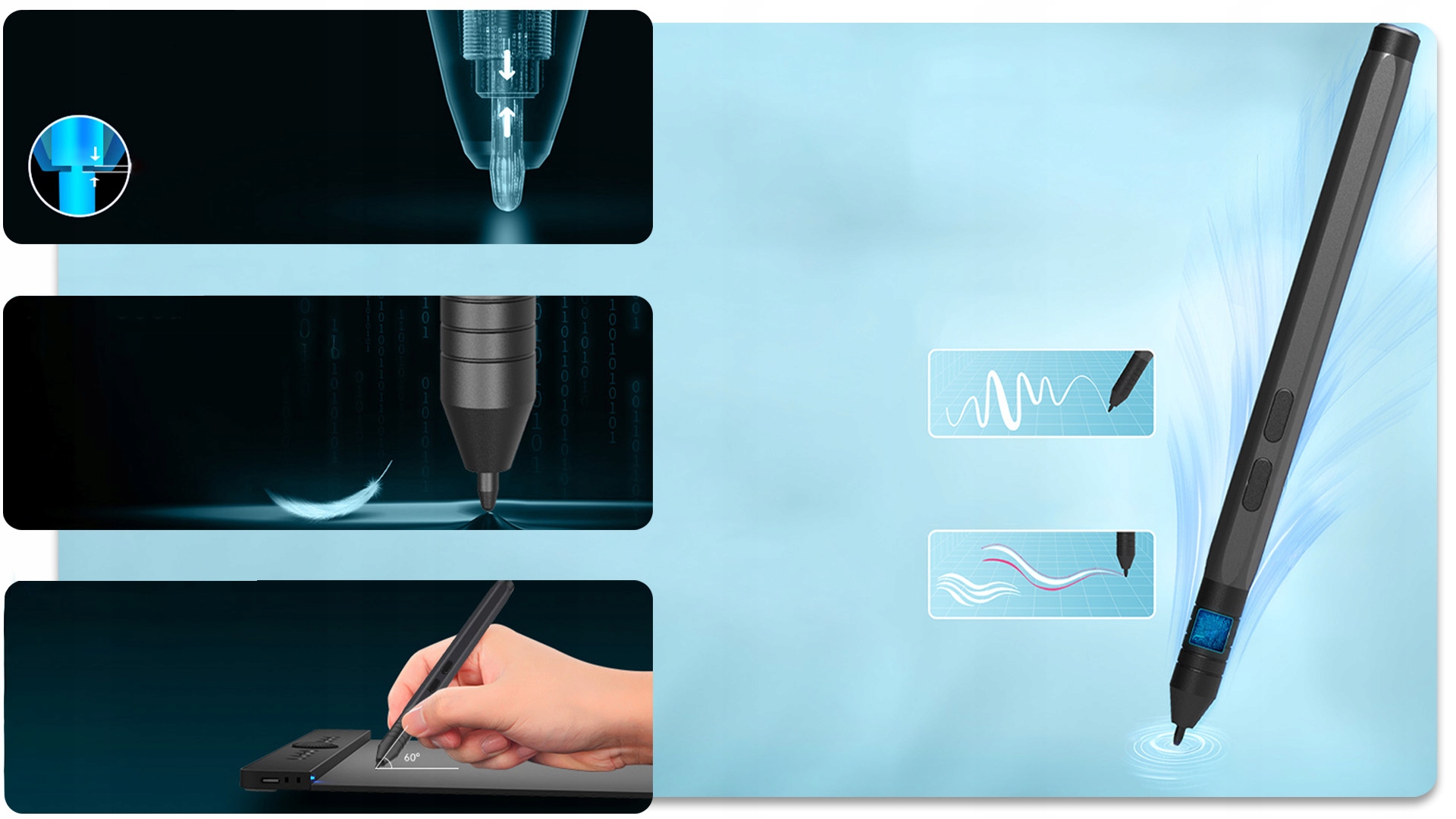 До 16384 уровней давления позволяют точно контролировать толщину и интенсивность линии — чем сильнее вы нажимаете, тем четче линия. Высокая скорость отправки отчетов 300 точек в секунду (300 RPS) гарантирует немедленный ответ и отсутствие задержек. Планшет также поддерживает распознавание угла наклона стилуса до ±60°, что позволяет рисовать естественно и в соответствии с вашими индивидуальными привычками.