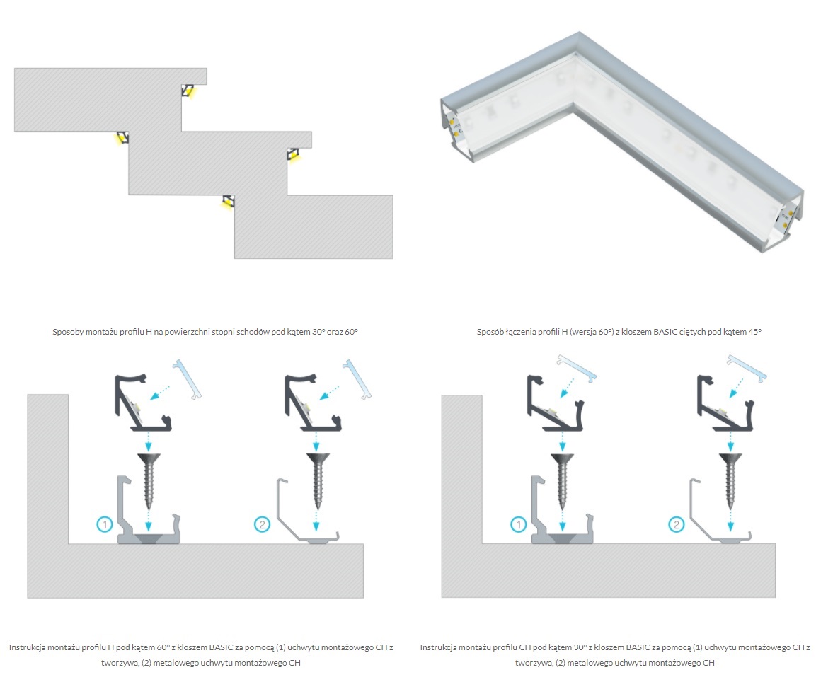 Алюминиевый Н-профиль уголок с углом наклона светодиодной ленты/ленты на выбор в зависимости от установки: 30 или 60 градусов. Один из самых минималистичных и современных дизайнов. Идеально подходит для дизайнерского соединения двух перпендикулярных поверхностей и там, где необходимо направить свет, исходящий от профиля, под углом 30/60 градусов. Идеально подходит для освещения полок магазинов, кухонных столешниц и шкафов.