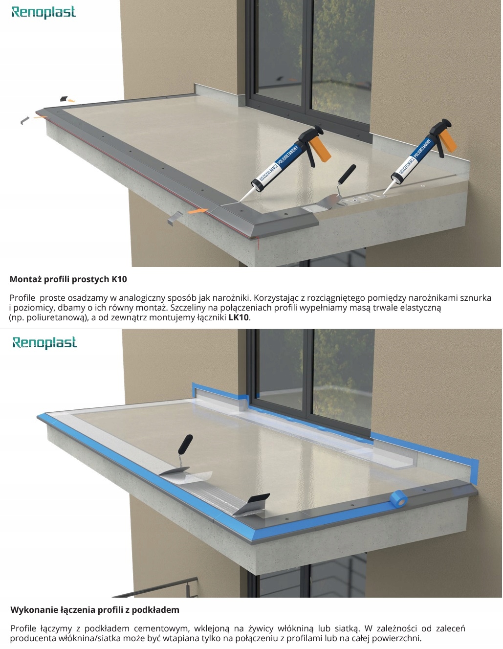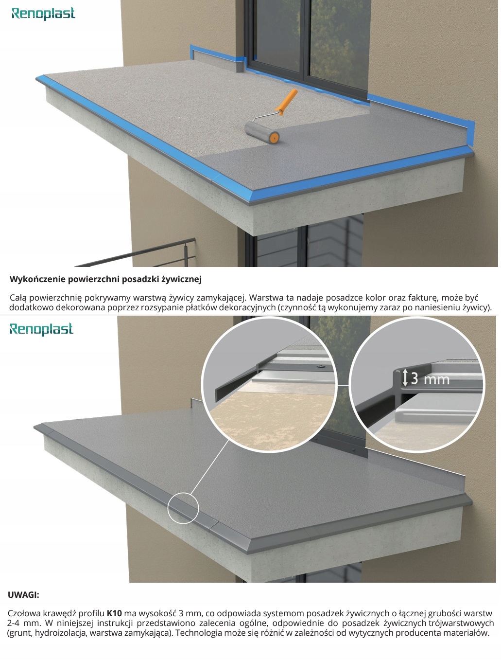 ренопласт K10 b> -это профиль капота для завершения края балконов с тонко -слоями żywiwczenia. Конструкция профиля обеспечивает плотное соединение с изоляцией и смолой. Изготовлен из алюминия, покрытого полиэфирным покрытием, обеспечивающего плотное соединение с изоляцией и полом, используемое в герметизированной минометной изоляционной системы или смола, с полом, изготовленным из смолы толщиной 2-3 мм.