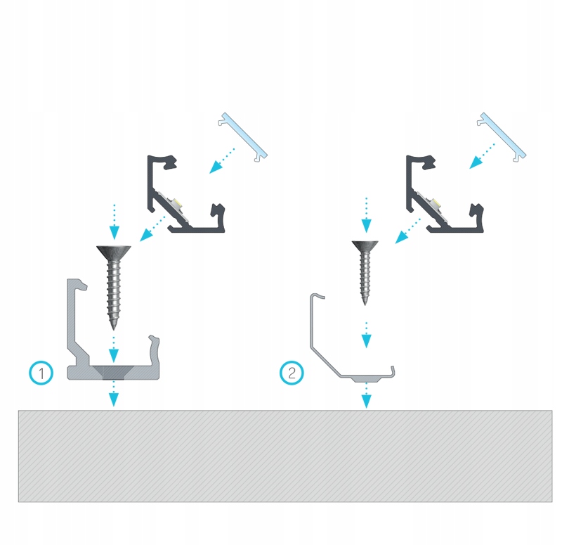 3) Инструкция по монтажу углового профиля С с крышкой BASIC с использованием (1) пластикового монтажного кронштейна CH, (2) металлического монтажного кронштейна CH.