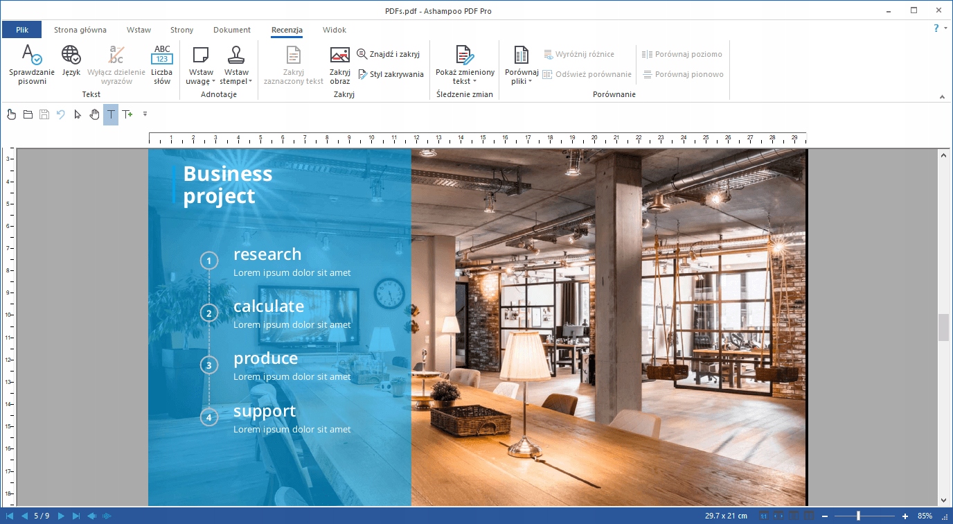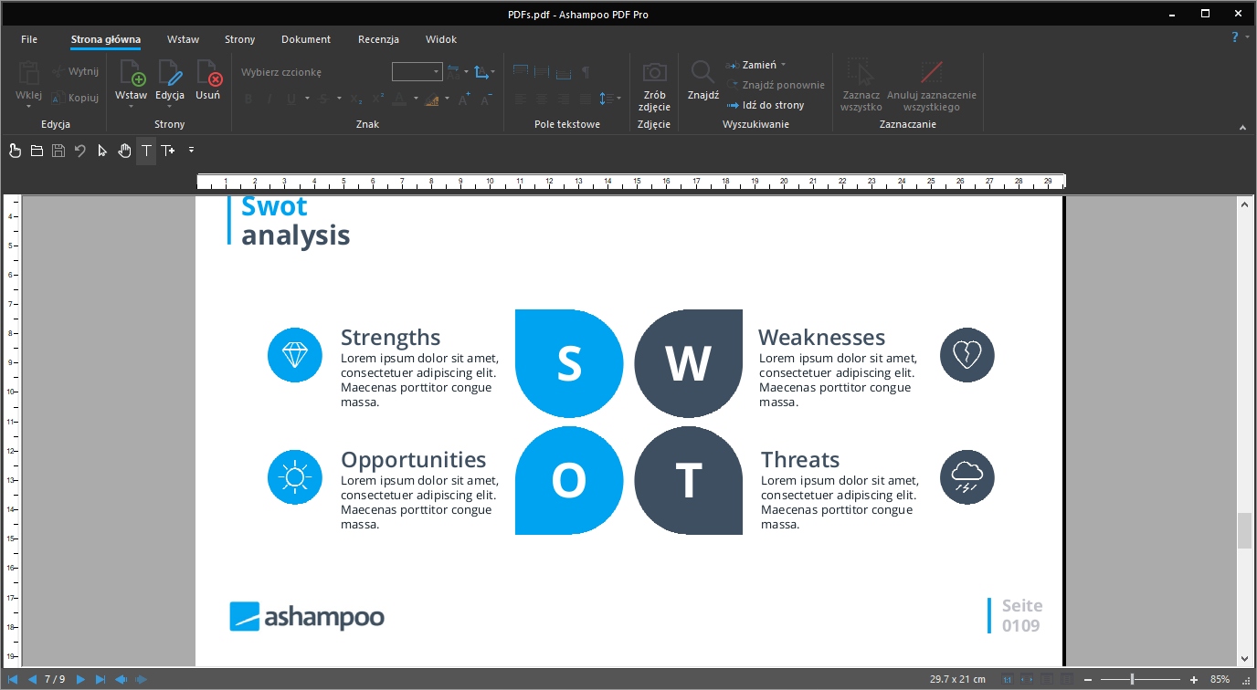 С Ashampoo PDF Pro вы может изменять, добавлять, удалять и форматировать абзацы текста или целые страницы. При необходимости программа может выделить последние изменения благодаря встроенному инструменту отслеживания изменений. Встроенная проверка орфографии помогает избежать ошибок, а автоматическое выделение текста помогает организовать ваш контент.