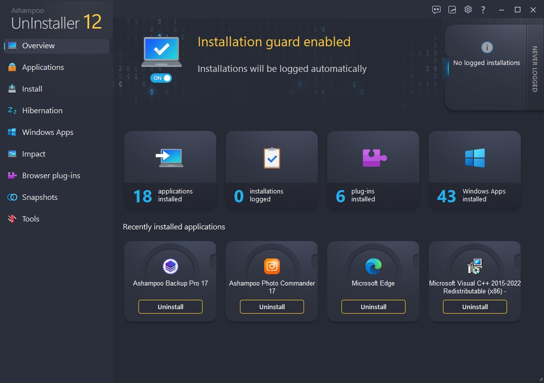 Ashampoo® UnInstaller 12 предоставляет вам всю мощь вашего система! Вы можете перевести программы, которые не используете, в спящий режим, перейдя в режим гибернации. Это означает, что связанные записи автозагрузки, задачи и службы больше не будут активироваться вместе с операционной системой, пока вы не запустите их вручную! Популярные модули очистки имеют улучшенные алгоритмы, которые работают до 50% быстрее, чем когда-либо прежде! Кроме того, они используют меньше памяти и полностью поддерживают новейшие браузеры, включая, конечно же, последнюю версию Windows 11! Кроме того, новая система управления файлами cookie взаимодействует между браузерами, что упрощает исключение важных файлов путем указания провайдера или домена. Визуальные улучшения, повышенная простота использования и повышенная безопасность: все это и многое другое в лучшей в своем классе программе удаления. Приготовьтесь к Ashampoo® UnInstaller 12!