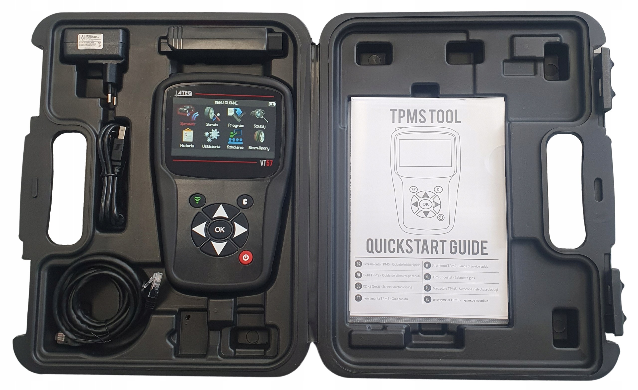 ATEQ VT57 OBDII — универсальное устройство последнего поколения для активации, копирования (клонирования), сканирования, чтения и хранения данных датчика давления TPMS. Позволяет загружать данные датчика в компьютер ЭБУ автомобиля через б> разъем OBDII. Устройство имеет встроенный модуль радиопередачи, обеспечивающий быструю связь с датчиком для считывания давления, температуры, идентификационного номера и состояния батареи или ее программирования/перепрограммирования. Устройство включает в себя очень обширную функцию помощи, которая шаг за шагом помогает пользователю разобраться с тем или иным автомобилем. Кроме того, для интересующихся в стоимость устройства входит бесплатное обучение, знакомящее с вопросом программирования с помощью устройства ATEQ VT57 OBDII - БЕСПЛАТНО! Обучение проводится в штаб-квартире нашей компании в день, согласованный обеими сторонами.