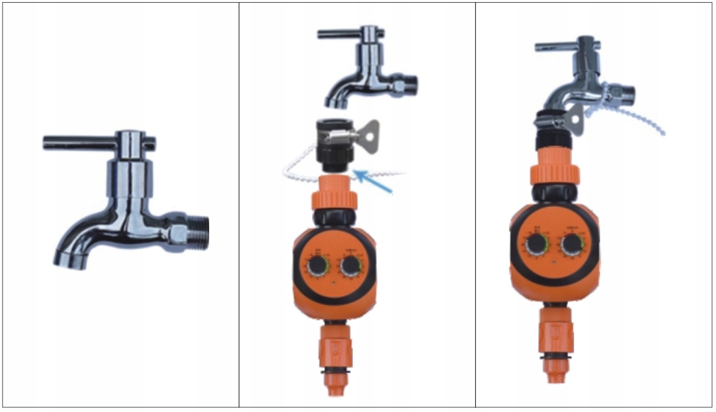 Он имеет ручку для регулировки частоты полива. Устройство оснащено 11 режимами полива и функцией сброса. Вторая ручка используется для регулировки времени полива (10 режимов). Имеет функцию датчика дождя, в зависимости от уровня воды в баке контроллер останавливает или запускает процесс полива.