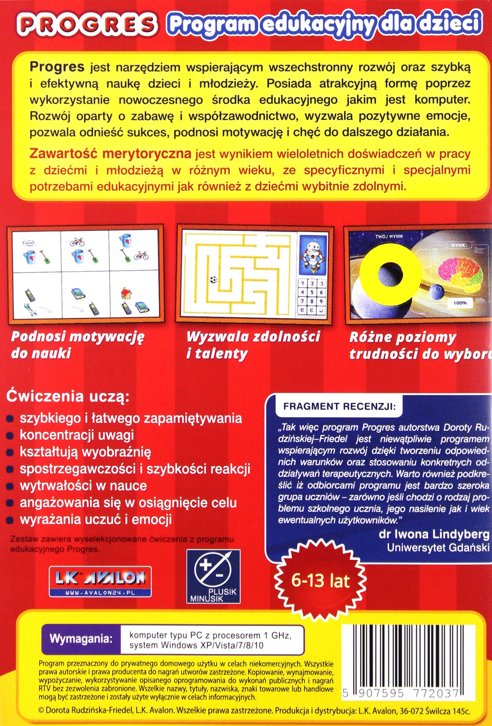Progres — инструмент, поддерживающий комплексное развитие функций, отвечающих за быстрое и эффективное обучение детей и подростков. Он имеет привлекательную форму благодаря использованию такого современного образовательного средства, как компьютер. Развитие, основанное на веселье и соревновании, вызывает положительные эмоции, способствует успеху, повышает мотивацию и желание продолжать работу. Содержание является результатом многолетнего опыта работы с детьми и молодежью разных возрастов, с особыми образовательными потребностями, а также с исключительно одаренными детьми. Оно предназначено для детей в возрасте 6-13 лет. - Повышает мотивацию к обучению - Раскрывает способности и таланты - Различные уровни сложности на выбор - Дополнительно включает двигательные упражнения! Упражнения на память учат: - быстрому и легкому запоминанию - концентрации внимания - формированию воображения - восприимчивости и скорости реакции - настойчивости в обучении - вовлеченности в достижение цели - выражению чувств и эмоций