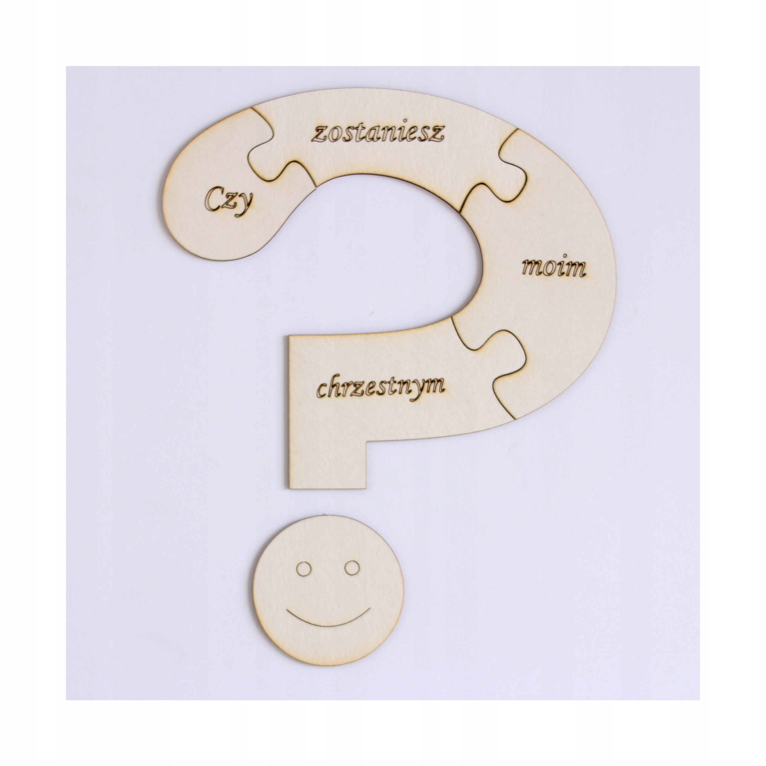 Пазлы выжигаются лазером. После складывания они образуют вопросительный знак с просьбой стать крестной матерью или крестным отцом, видимый на фотографиях ниже.