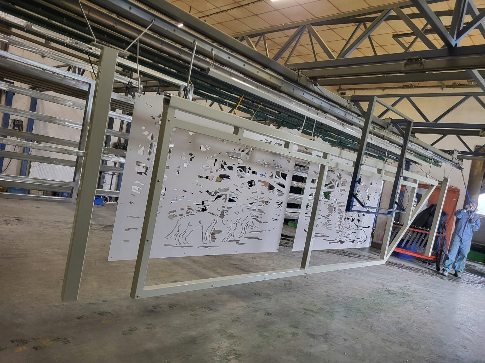 Каждый элемент перед покраской проходит детальный процесс подготовки. Мы тщательно очищаем поверхность химическим способом, наносим цинковую грунтовку и выравниваем кромки среза, что обеспечивает равномерность нанесения краски и высокую долговечность покрытия. Благодаря этому мы исключаем риск более быстрого истирания и коррозии, которые часто возникают на острых кромках элементов, вырезанных лазером.