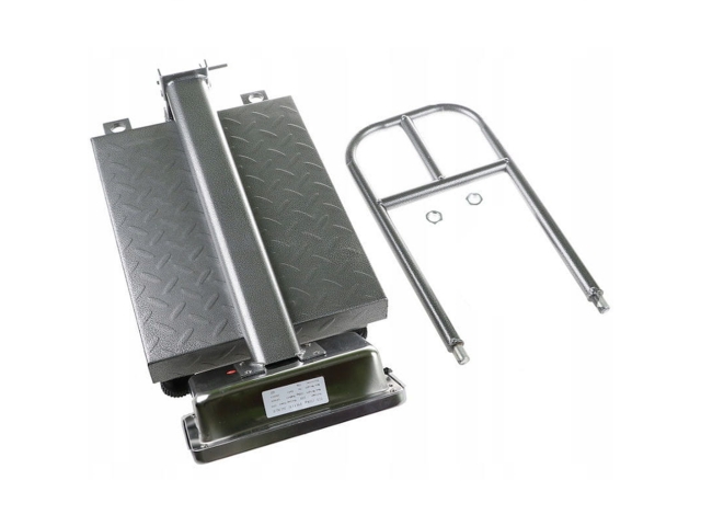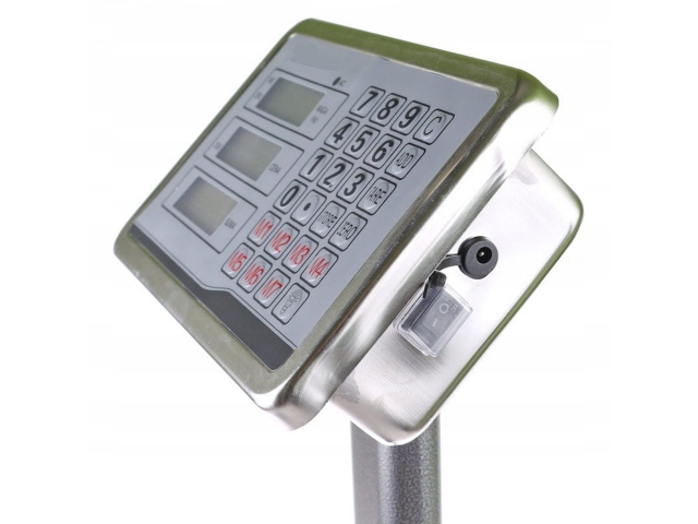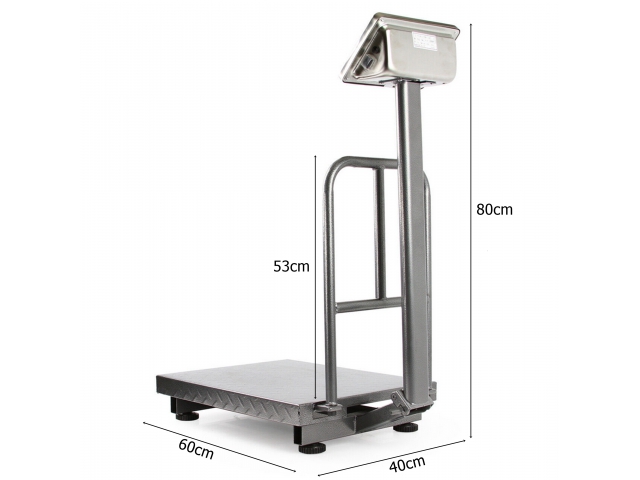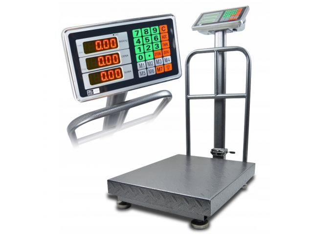Вес электронной платформы до 300 кг с кронштейном и большим зеленым ЖК -дисплеем. Он имеет 7 память о программировании памяти и встроенную батарею. Сплошная стальная конструкция, покрытая защитной молоткой краской. Профилировал не -сколепающую шаль с размерами 50x40 см и неокруженной кронштейна.