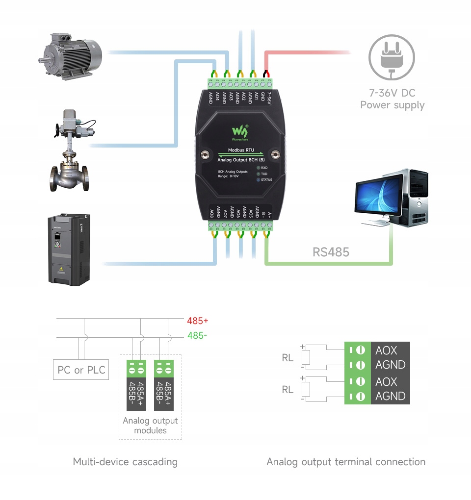 Промышленный 8-канальный модуль аналогового вывода, цифро-аналоговое преобразование в 12 бит, позволяет одновременно генерировать напряжение или ток на 8 каналах, широкий диапазон мощности постоянного тока источник от 7 до 36 В, использует протокол Modbus RTU, поддерживает монтаж на рейку.
