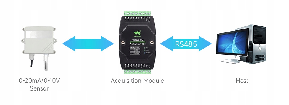 Поддерживает отправку команд протокола Modbus RTU через шину RS485 для загрузки данных датчиков в диапазоне 0–20 мА / 0–10 В.