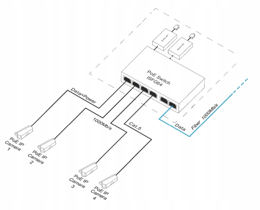 ISFG64 — это 6-портовый коммутатор PoE, предназначенный для питания IP-камер, работающих в стандарте IEEE 802.3af/at. Коммутатор на портах с 1 по 4 имеет функцию автоматического обнаружения устройств с питанием в стандарте PoE/PoE+. Порты UP LINK (обозначены цифрами 5 и 6) используются для подключения дополнительных сетевых устройств через оптоволокно (необходимо использовать вставку GBIC). На передней панели отображается рабочее состояние устройства с помощью светодиодов. Устройство имеет решения, позволяющие питать его от двух источников (аварийный источник питания, резервный источник питания) – в случае выхода из строя одного источника он немедленно переключается на резервный. Технология PoE обеспечивает подключение к сети и снижает затраты на установку за счет устранения необходимости прокладывать отдельный кабель питания для каждого устройства. Помимо камер, таким способом могут питаться сетевые устройства, использующие данную технологию, например IP-телефон, точка доступа, маршрутизатор (монтажная рейка на фото в продажу не входит).