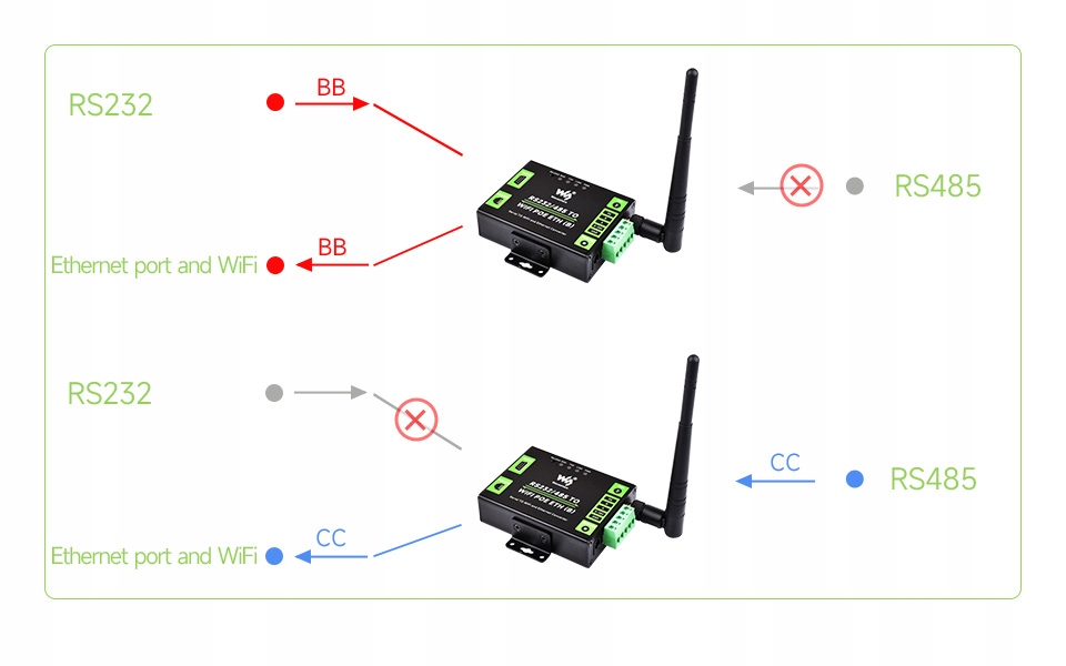 RS232/485 в порт Ethernet и WiFi Только один из портов RS232 или RS485 может одновременно передавать данные в порты Ethernet и WiFi.