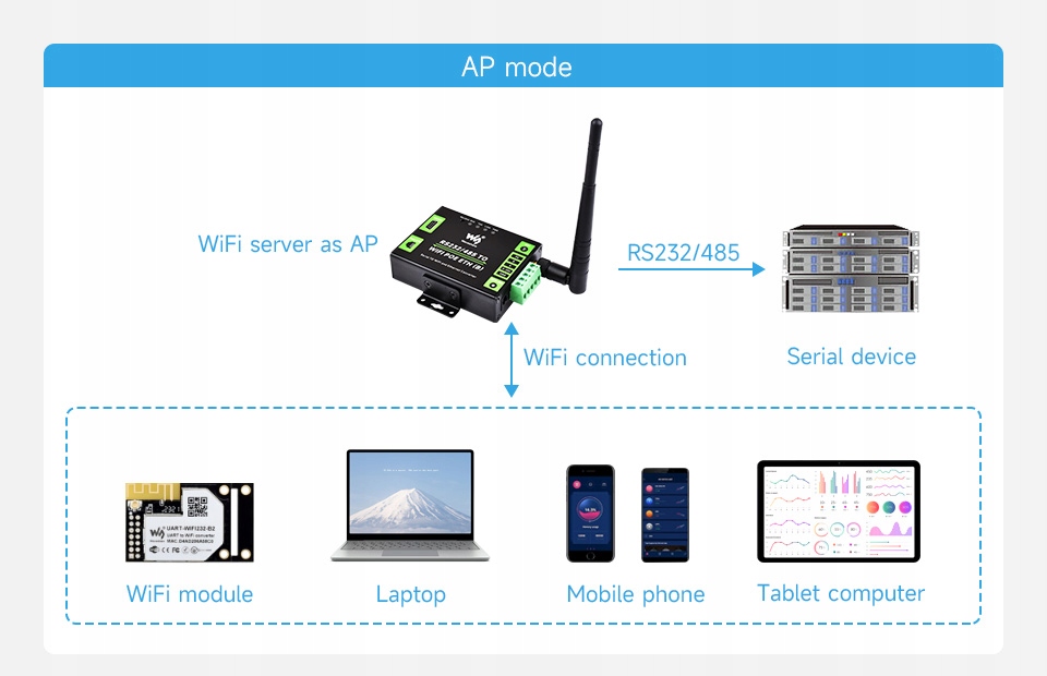 Порт Ethernet и Wi-Fi для RS232/485 Порт Ethernet и Wi-Fi могут одновременно передавать данные к двум последовательным портам.
