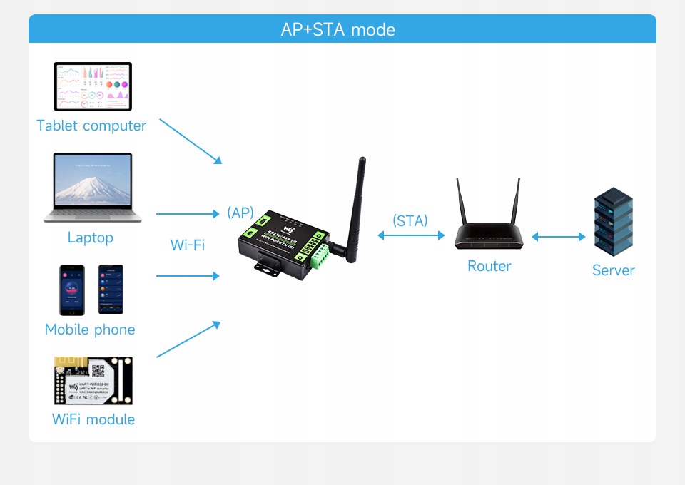 Поддержка различных методов беспроводной сети. Поддерживает режим точки доступа (AP), режим станции (STA) и режим AP + станция (AP+STA).
