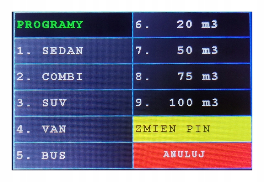 - автоматические программы озонирования автомобилей: СЕДАН, КОМБИ, Внедорожник, ФУРГОН, АВТОБУС