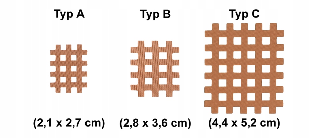 Пластыри с перекрестной лентой выпускаются в трех размерах (типах). Размер А (S) предназначен для детей или области лица, его можно использовать более длительный период в местах, где кожа подвергается сильному растяжению. Размеры B (M) и C (L) предназначены для больших участков тела, менее подверженных растяжению, например, внешней поверхности бедра, рук, ног и т. д.