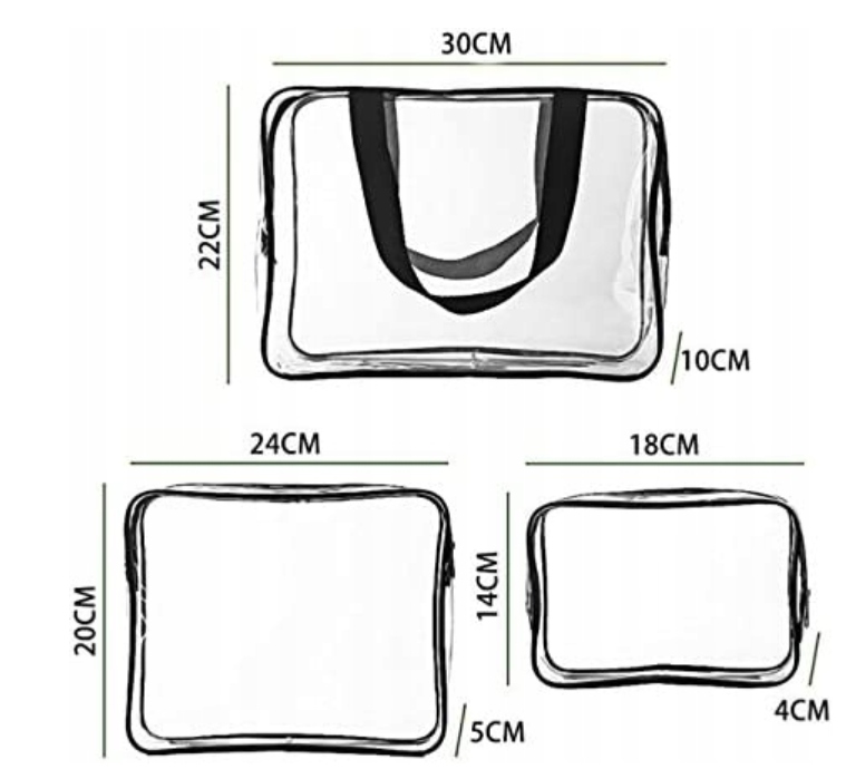 Набор состоит из трех прозрачных косметичек – большой, средней и маленькой – изготовленных из водонепроницаемого ПВХ-пластика, который легко чистится. Они идеальны для использования в путешествиях.