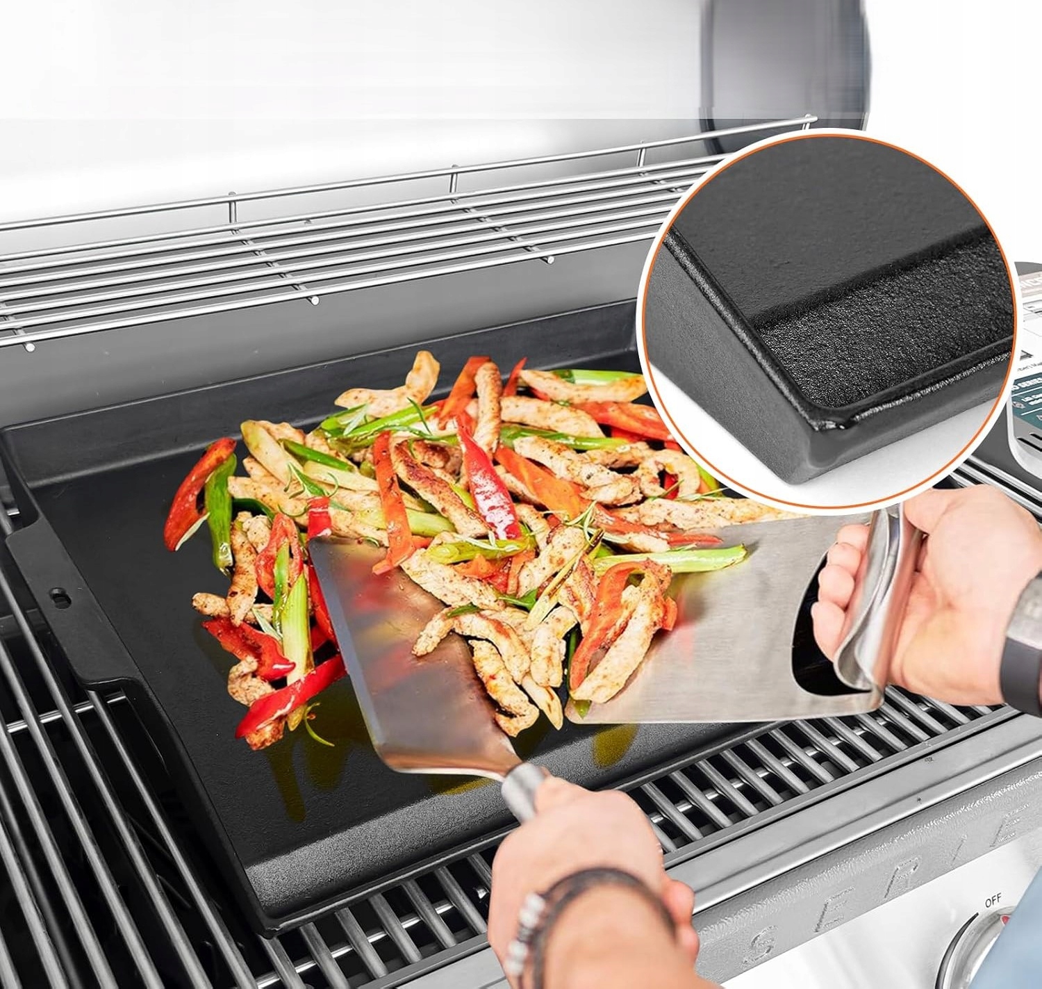 Подходит для газовых грилей, угольных грилей и газовых плит. Он позволяет готовить множество блюд, таких как блины, яйца, бекон, рыба, гамбургеры, овощи и сэндвичи.