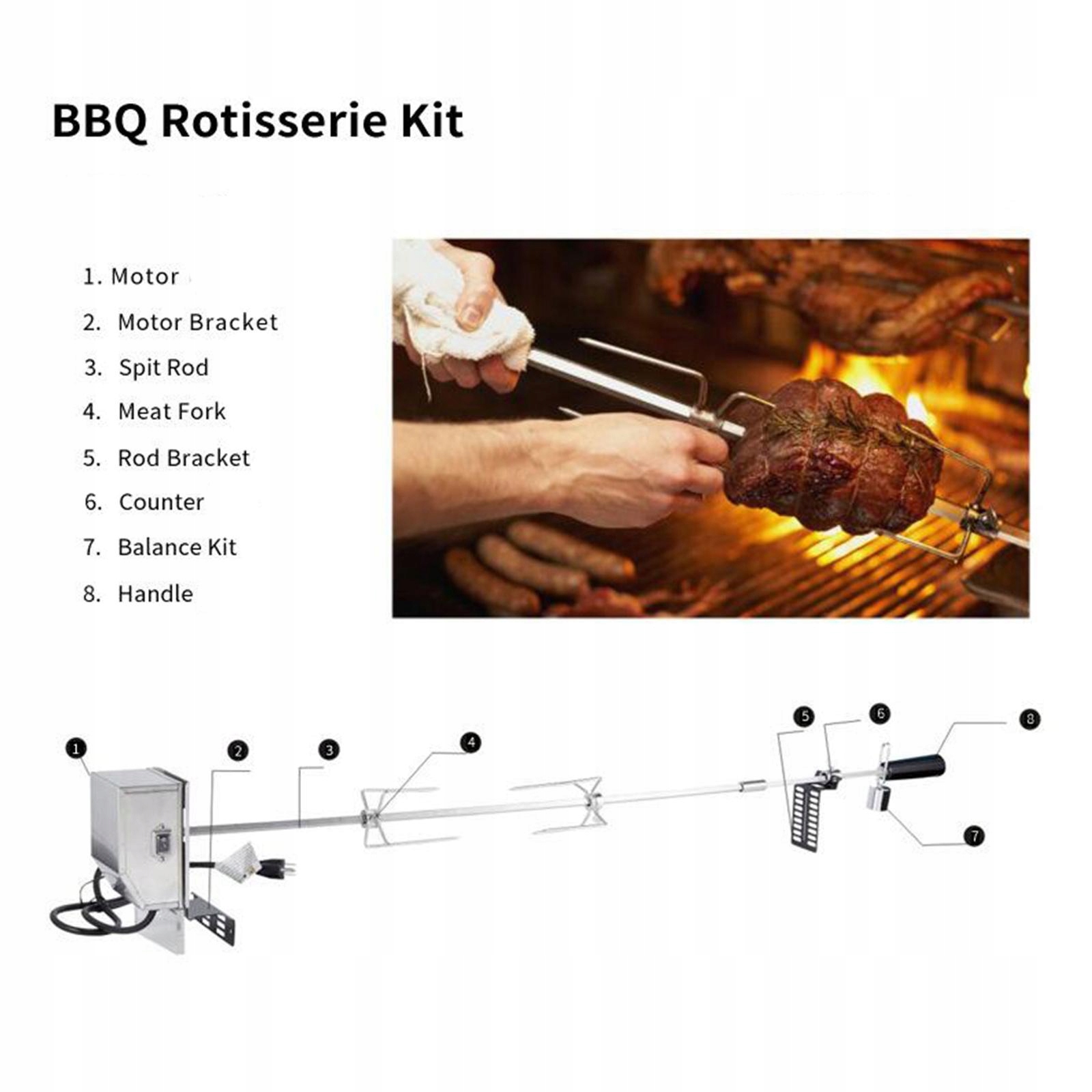 Содержимое упаковки: 1 двигатель, 2 стержня для гриля, 2 вилки для мяса, 1 ручка, 1 втулка вала, 1 комплект опорных листов.