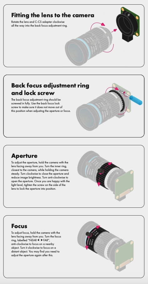 Телеобъектив 16 мм совместим с камерами с байонетом C, такими как официальная камера Raspberry Pi HQ (RA094) с входящим в комплект адаптером для крепления C-CS.