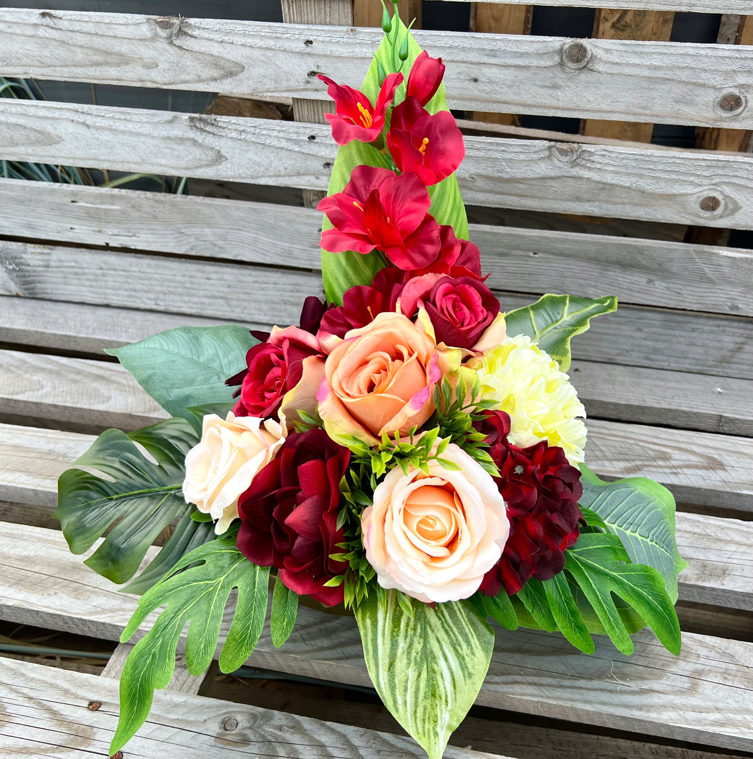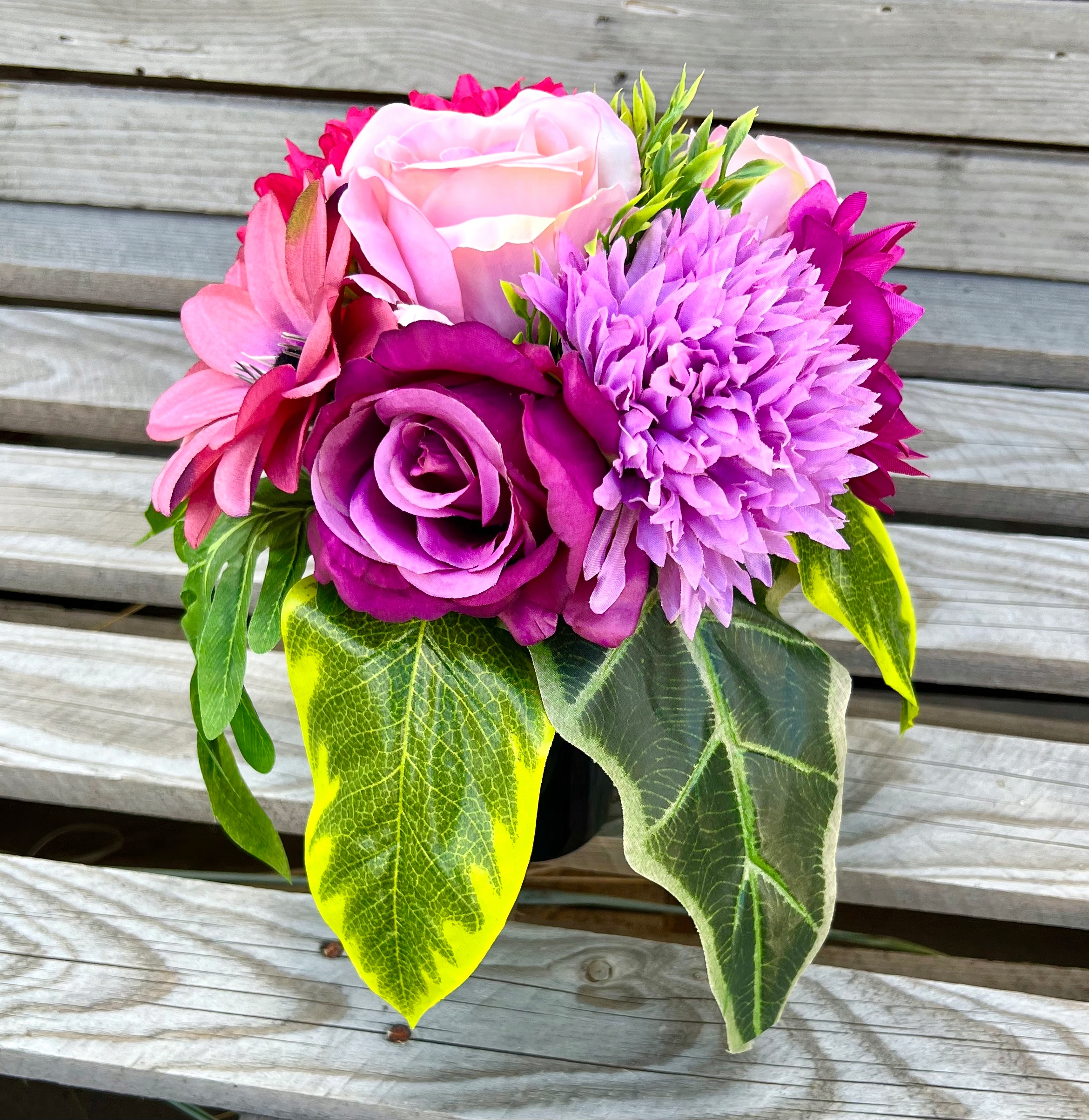 Красивый букет + букет – композиция очаровательная, как живая, но останется на могиле гораздо дольше, чем срезанные цветы.
