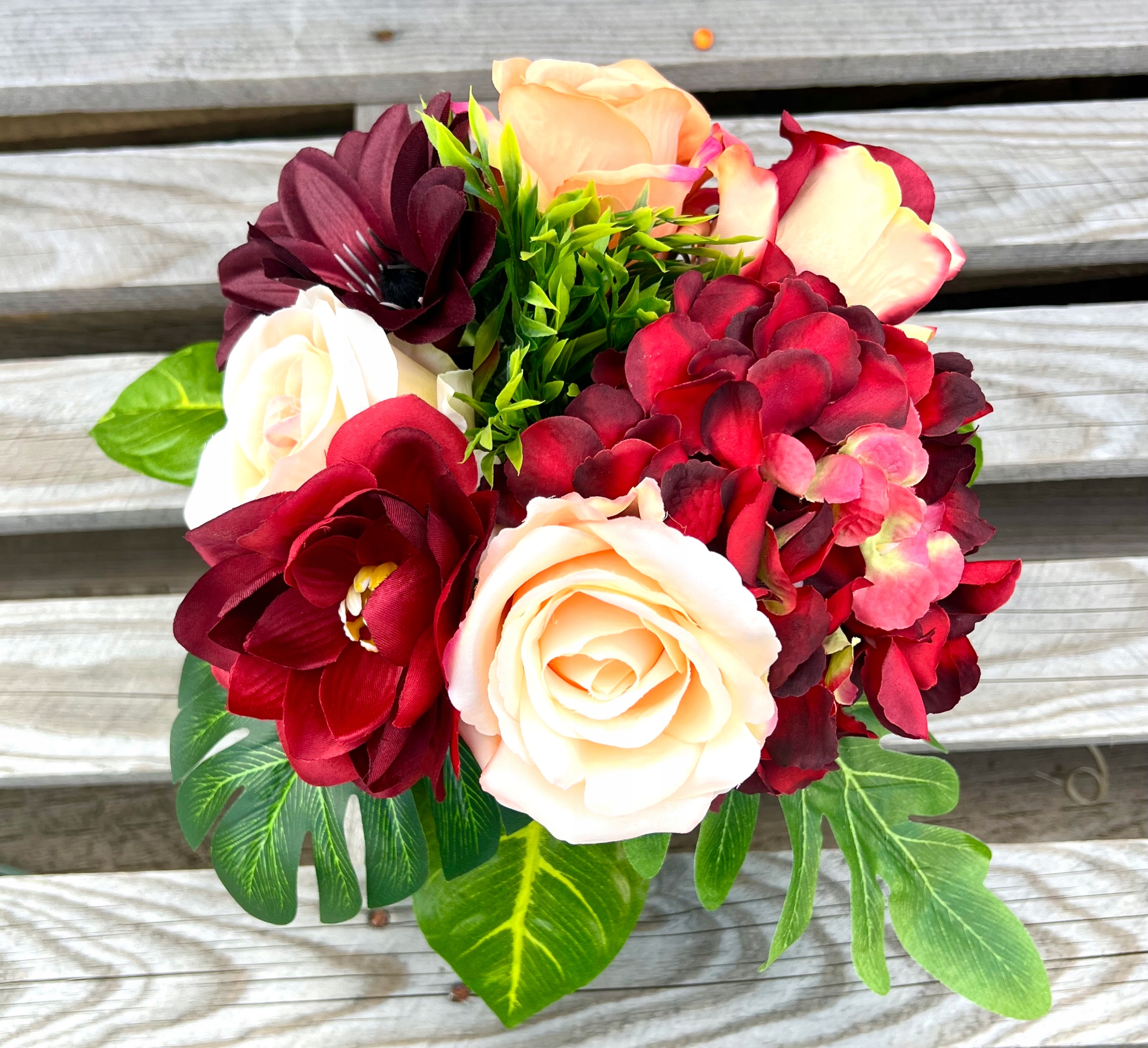 Богатый декор искусственными листьями делает букет красивым и естественным.