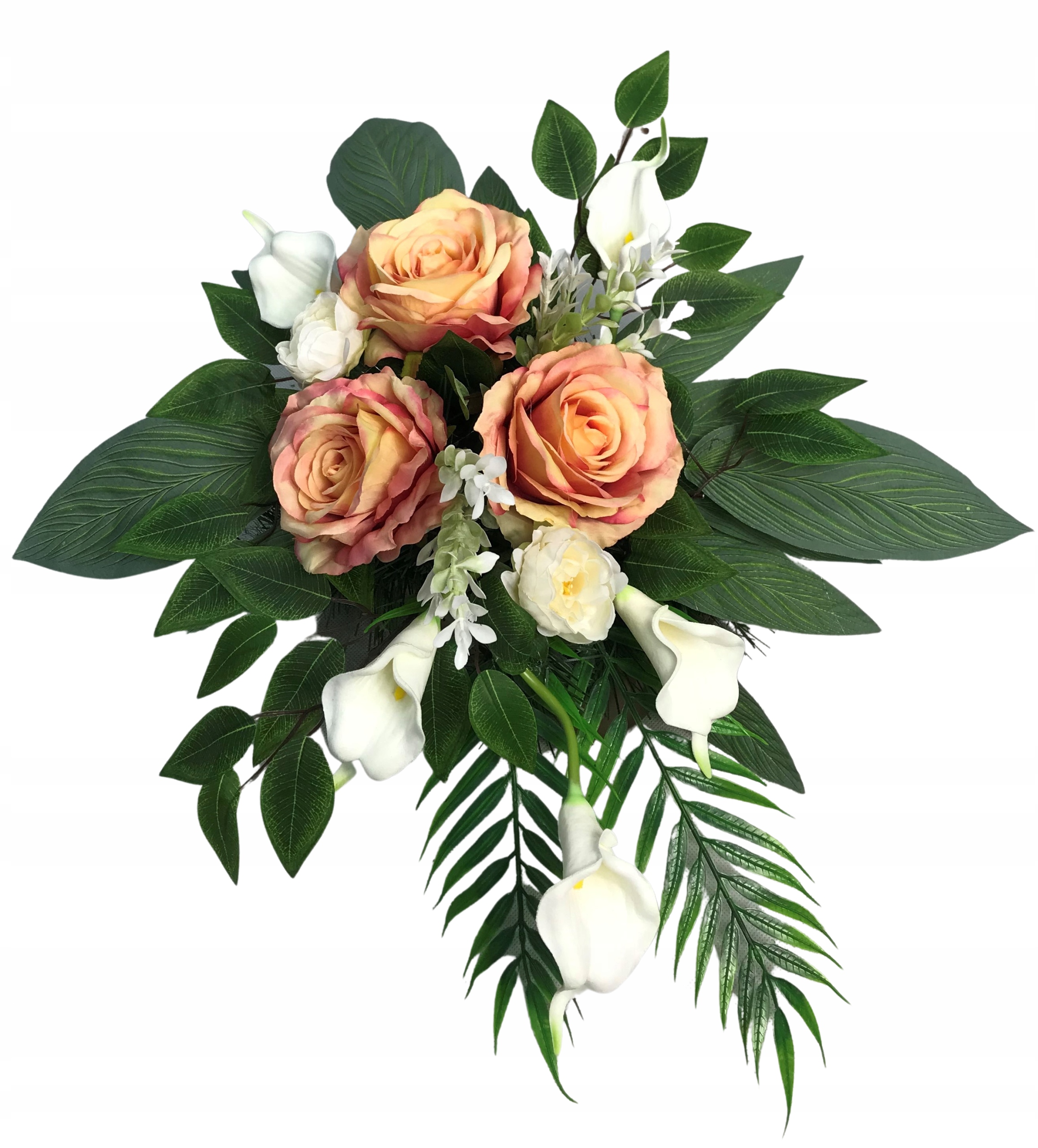 Цветочная композиция изготовлена из искусственных цветов высочайшего качества. и добавки. Для создания декора были использованы вневременные розы, маленькие пионы, красивые длинные каллы, большое количество зеленых листьев и украшения, прекрасно заполняющие пустые пространства.