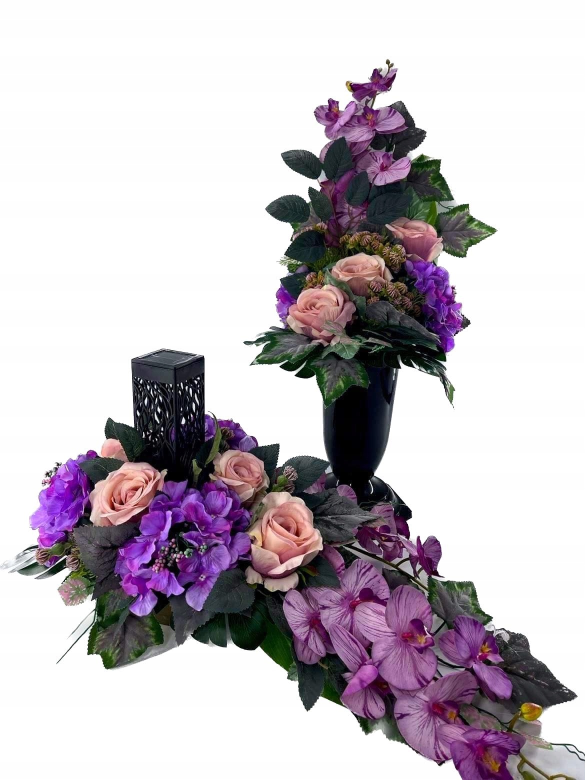 НАБОР СТРОЯ С ФОНАРЕМ И БУКЕТОМ В ВАЗЕ ДЛЯ КЛАДБИЩА - ФИОЛЕТОВЫЕ ЦВЕТА И НАСОКАЯ ЗЕЛЕНАЯ РАСТИТЕЛЬНОСТЬ.