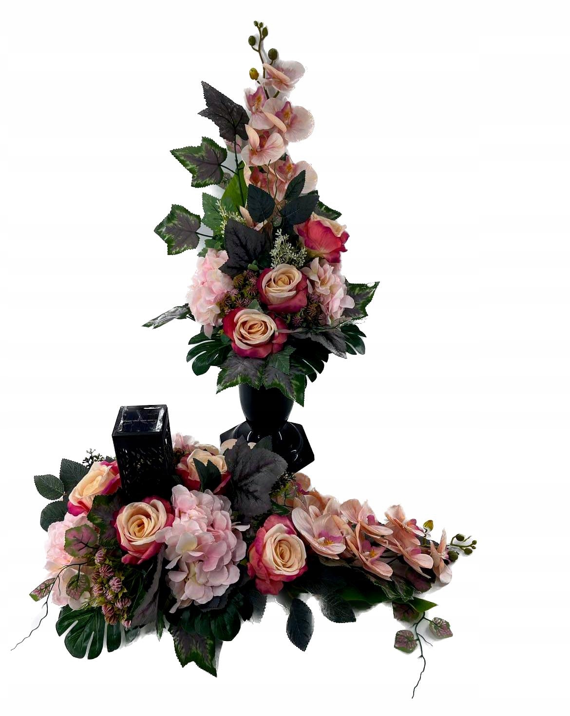 НАБОР С ФОНАРЕМ И БУКЕТОМ В ВАЗЕ ДЛЯ КЛАДБИЩА - РОЗОВЫЕ ЦВЕТА И НАСОКАЯ ЗЕЛЕНАЯ РАСТИТЕЛЬНОСТЬ.