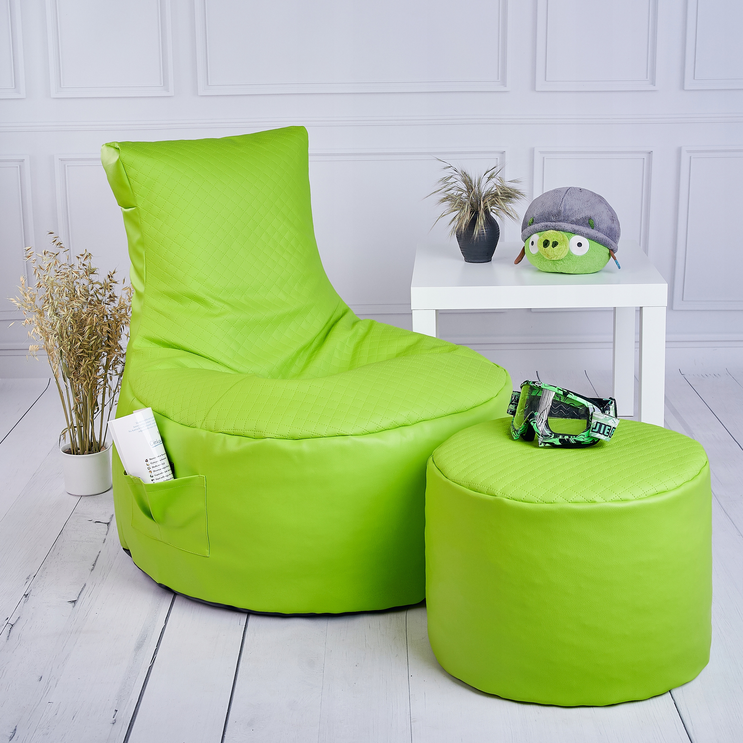- Прочный стеганый материал в верхней части пуфа и подставки для ног.