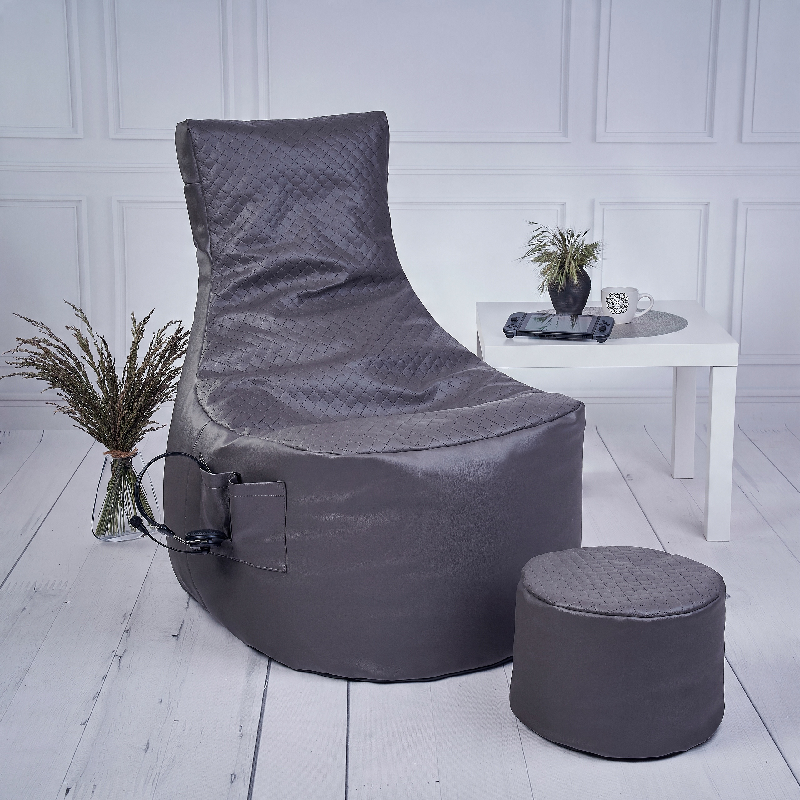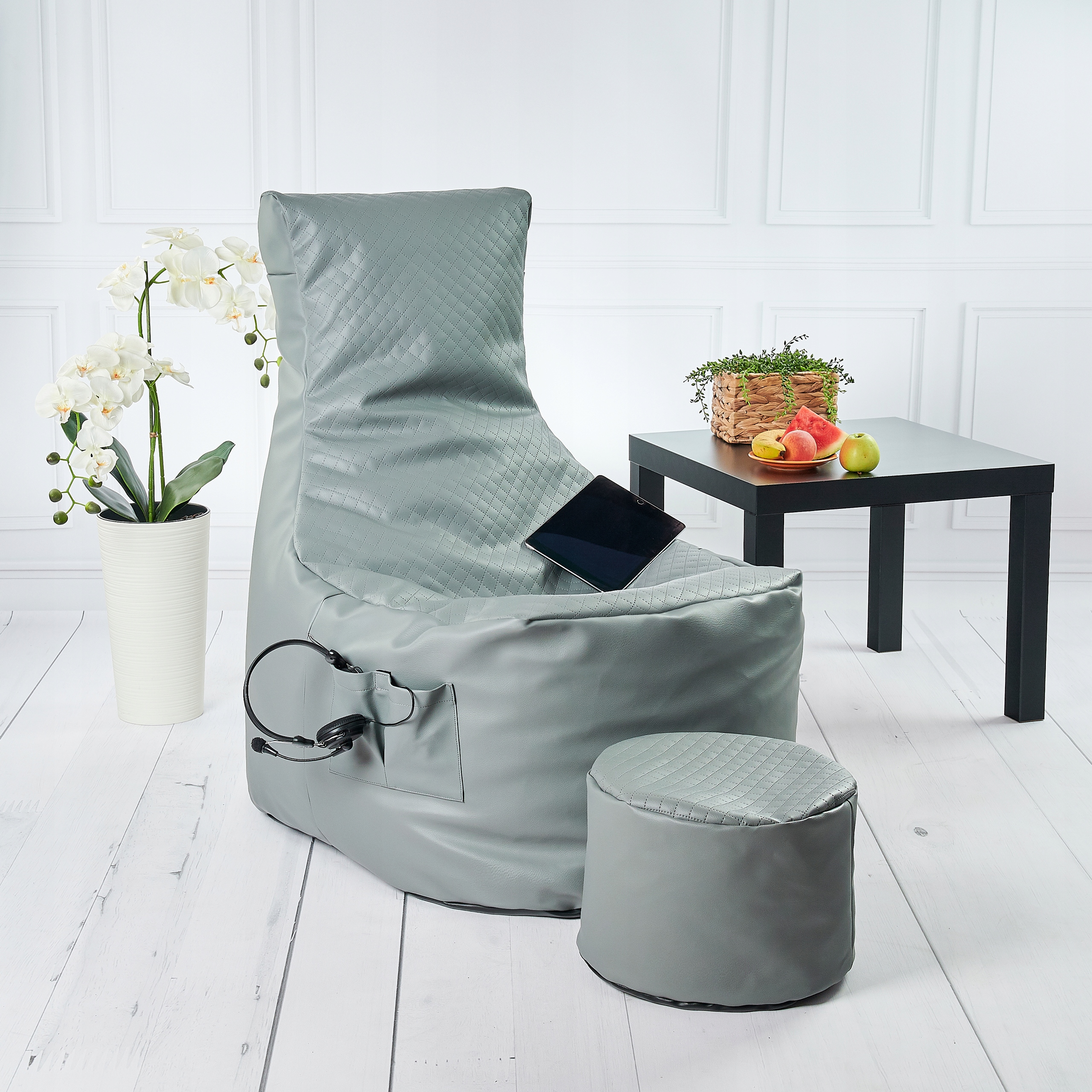 Наполнителем пуфа является гранулированный пенополистирол, благодаря чему его форма так хорошо адаптируется к телу пользователя.