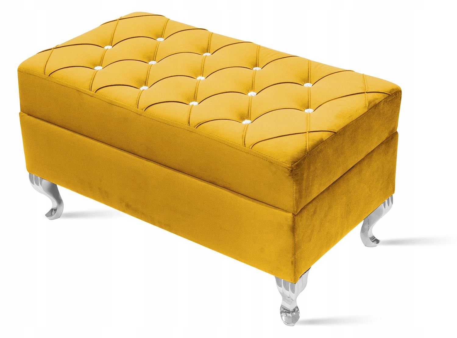 Мягкий пуф LEMON 18 с контейнером шириной 75 см. Мебель имеет привлекательную строчку и стежку из кристаллов. Прочный каркас из ДСП, усиленный массивом дерева, сиденье из пеноматериала Т30 толщиной 10 см. Представленная модель опирается на очень прочные металлические хромированные ножки. 100% польский продукт. Упаковано в пакет - требует прикручивания ножек.
