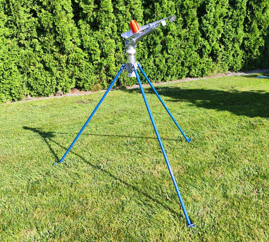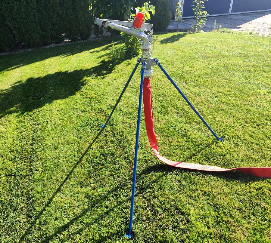 На концах ног от штатива есть противень с отверстием, к которому мы можем прикрепить разбрызгиватель к земле.