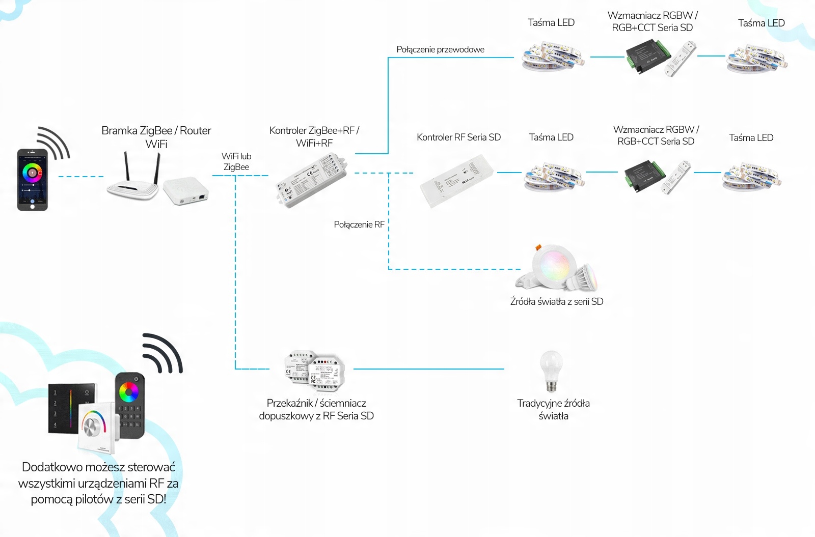Это высококачественный продукт, позволяющий управлять освещением до 4 зон. Пульт дистанционного управления позволяет управлять многоцветными светодиодными контроллерами RGB + CCT, 5-контактные ленты/цвета проводов + теплый и холодный белый.