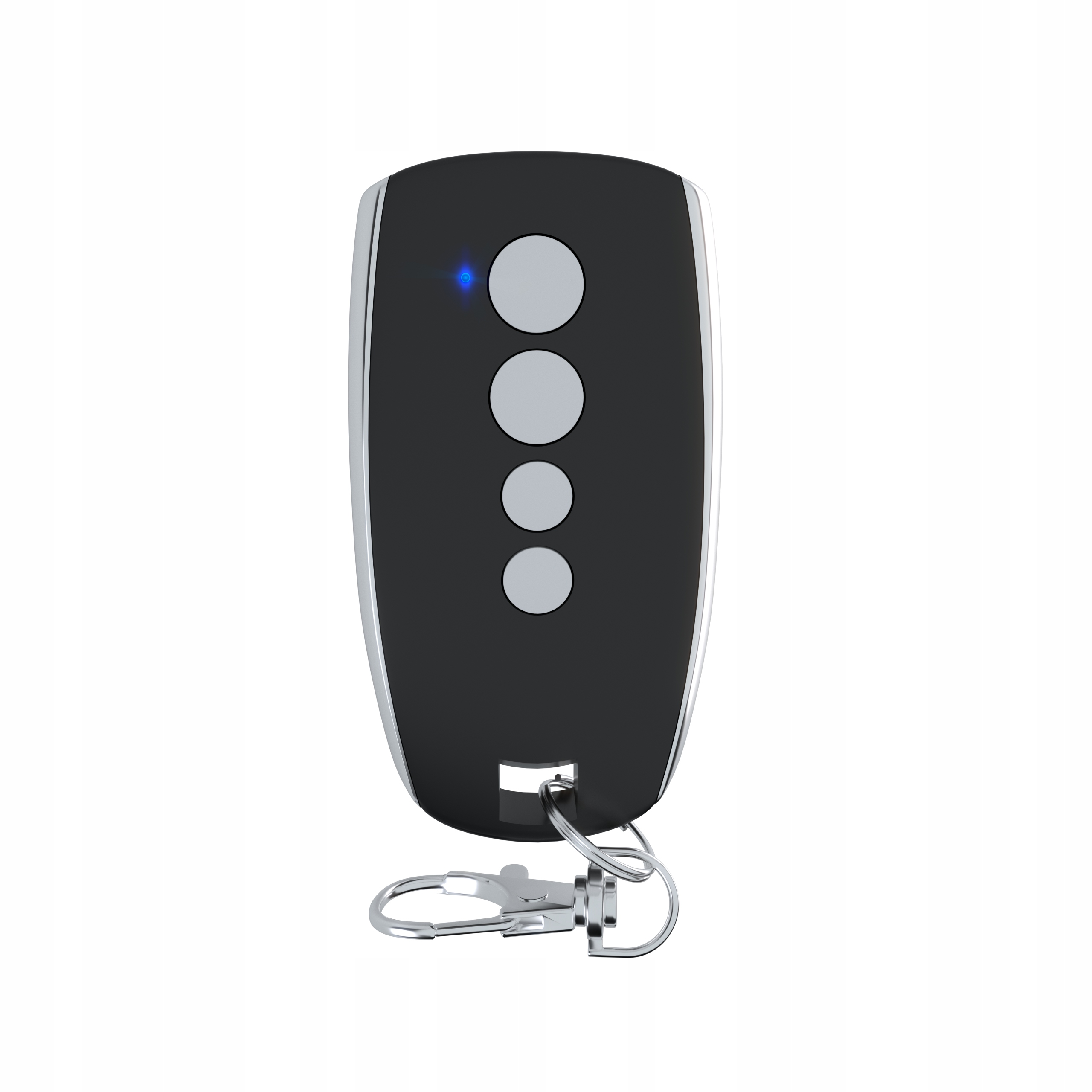 Четырехканальный элегантный пульт дистанционного управления в металлопластиковом корпусе. Клапан, защищающий от случайного нажатия кнопки.