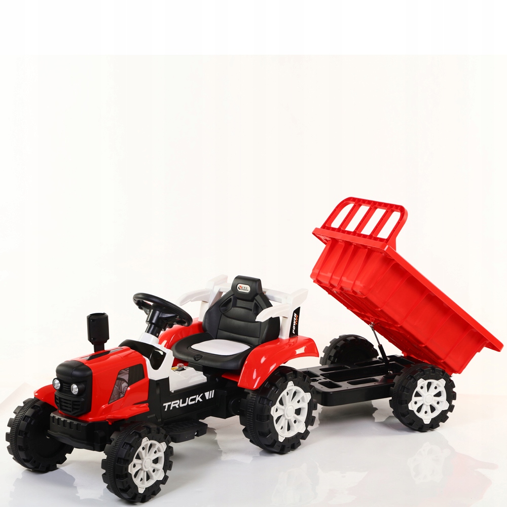 Аккумуляторный трактор. Привод обеспечивают два мощных электродвигателя, питающихся от аккумулятора емкостью 6В7Ач. Автомобиль оснащен звуковыми эффектами, активируемыми кнопками, входом для USB-накопителя, регулятором громкости, светодиодными фонарями. Есть 3 скорости движения, как вперед, так и назад. Безопасное обучение вождению обеспечивается включенным в комплект новейшим пультом дистанционного управления 2.4G, который дает родителю полный контроль над автомобилем. Съемный прицеп.