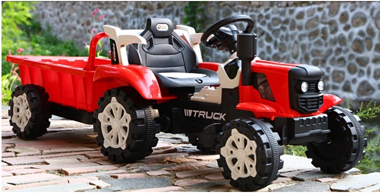 Трактор на аккумуляторе. Он приводится в движение двумя мощными электродвигателями, питаемыми от аккумулятора емкостью 6В7Ач. Автомобиль оснащен звуковыми эффектами, активируемыми кнопками, USB-портом для флэш-накопителя, регулятором громкости и светодиодными фонарями. Есть 3 скорости движения, вперед и назад. Безопасные уроки вождения обеспечиваются новейшим пультом дистанционного управления 2.4G, который дает родителю полный контроль над автомобилем. Съемный прицеп.