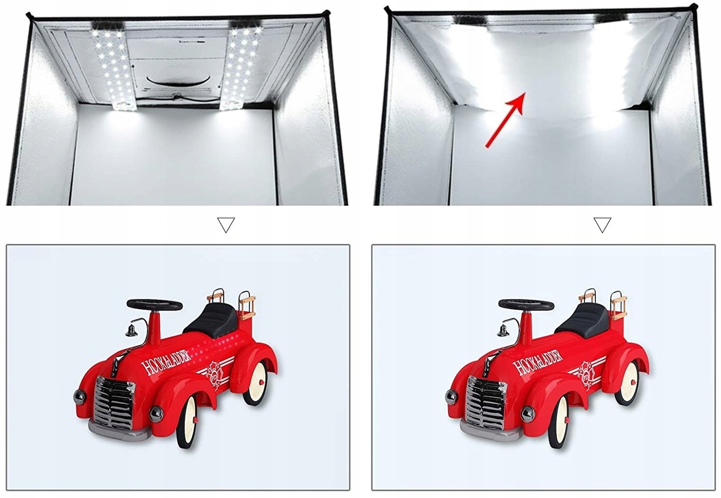 Широкая передняя часть позволяет фотографировать более крупные объекты, съемная передняя стенка позволяет избежать нежелательных отражений на поверхности, а отверстие в верхней части палатка позволяет фотографировать даже гладкие, зеркальные поверхности.