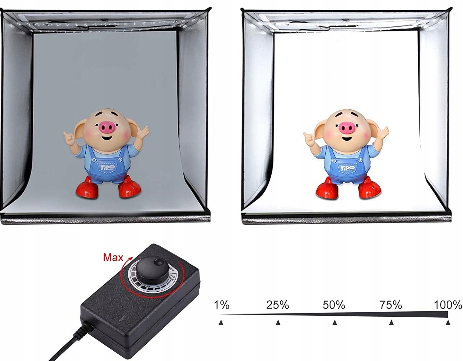 Две встроенные световые ленты с высококачественными светодиодами SMD и блок питания Мощность 80 Вт, яркость 8500 (2 х 4250) лм обеспечивают профессиональные результаты без особых усилий. Кроме того, яркость можно регулировать, что позволяет легко добиться различных световых эффектов одним движением руки. Теперь вы сможете легко делать фотографии студийного качества без теней. Шесть различных цветов фона и портативный дизайн являются дополнительными аргументами в пользу того, что наше решение является самой изысканной конструкцией такого типа на рынке по разумной цене.