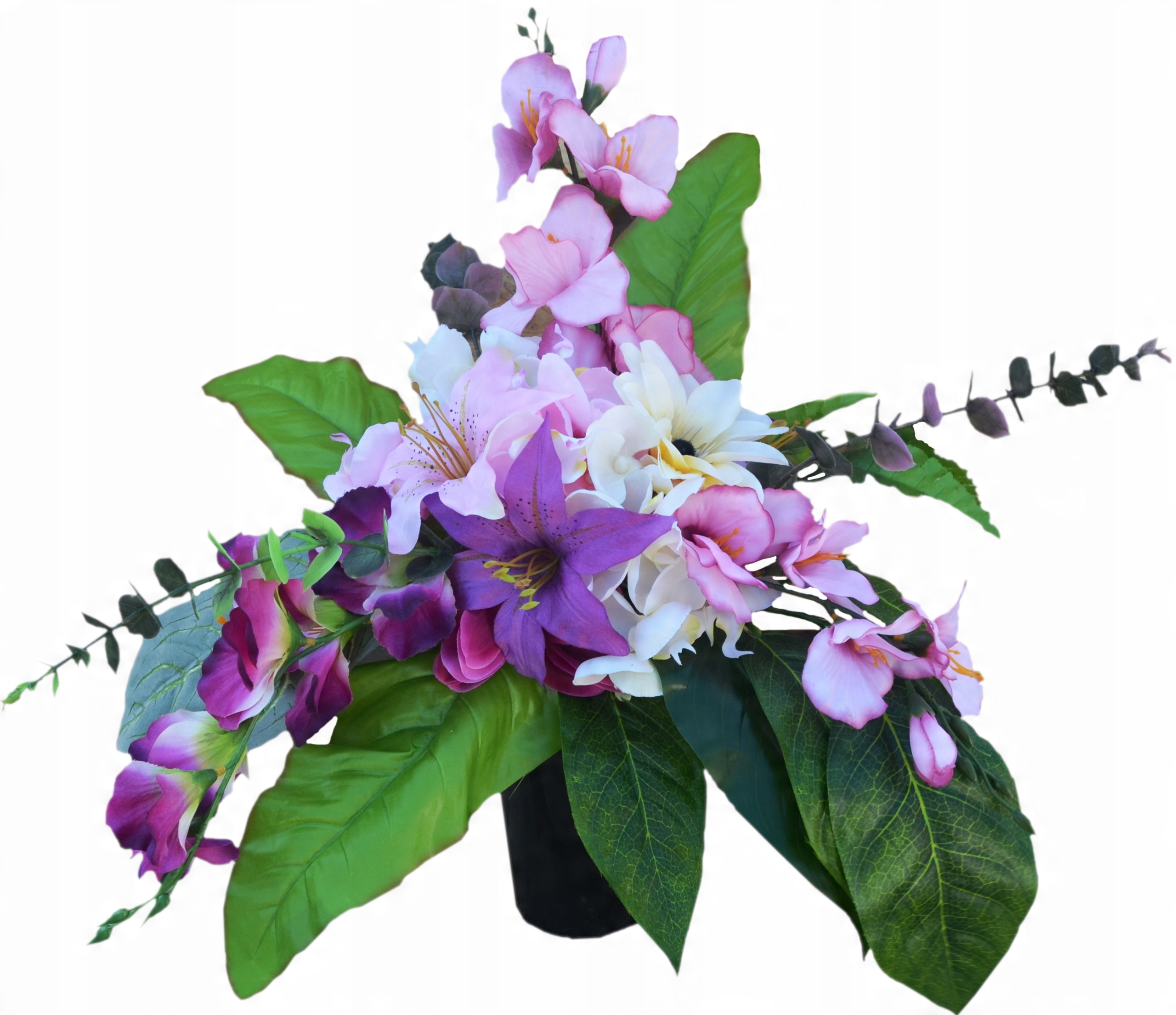 В состав букета и букета входит набор искусственных цветов пудрово-розового, фиолетового и кремового оттенков: