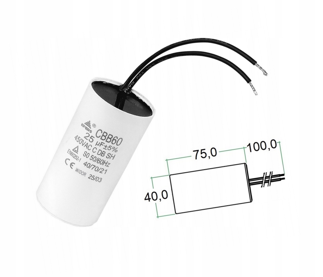 Предмет нашего предложения — качественный пусковой конденсатор с проводным выходом 25мкФ/450В.