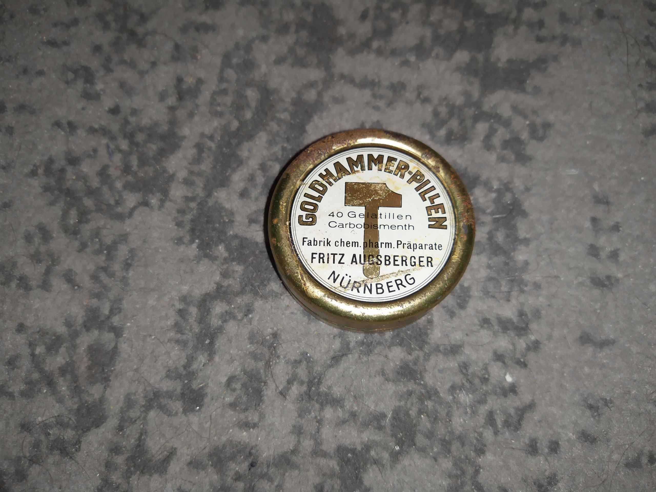 Банка с некоторыми лекарствами из ГДР, перевыпуск партии, выпущенной во время Второй мировой войны. Есть легкие следы использования и немного ржавчины. Аккуратная стирка с использованием соответствующих химикатов обязательно вернет ему внешний вид, купленный в магазине.