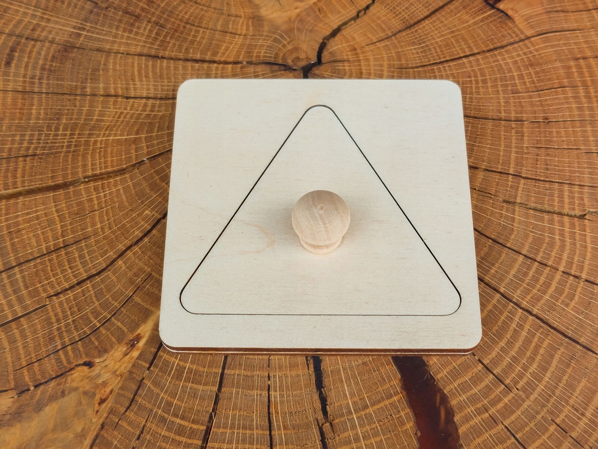 Пазл Монтессори, состоящий из кубика, изображающего геометрическую фигуру - треугольник.